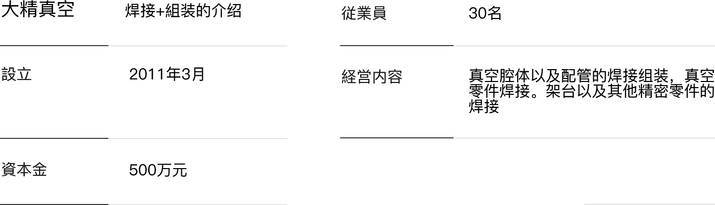 杭州大精真空技術有限公司成立于2010年,是杭州大精機械制造有限公司的子公司,是一家中日合資企業,總投資1000多萬元,現有36名技術員工,擁有自動焊機,氮檢漏等20多臺設備,主要從事真空腔體的焊接組裝,真空管接件的制造,主要客戶有日本神鋼集團,日立集團,華爾卡集團等。